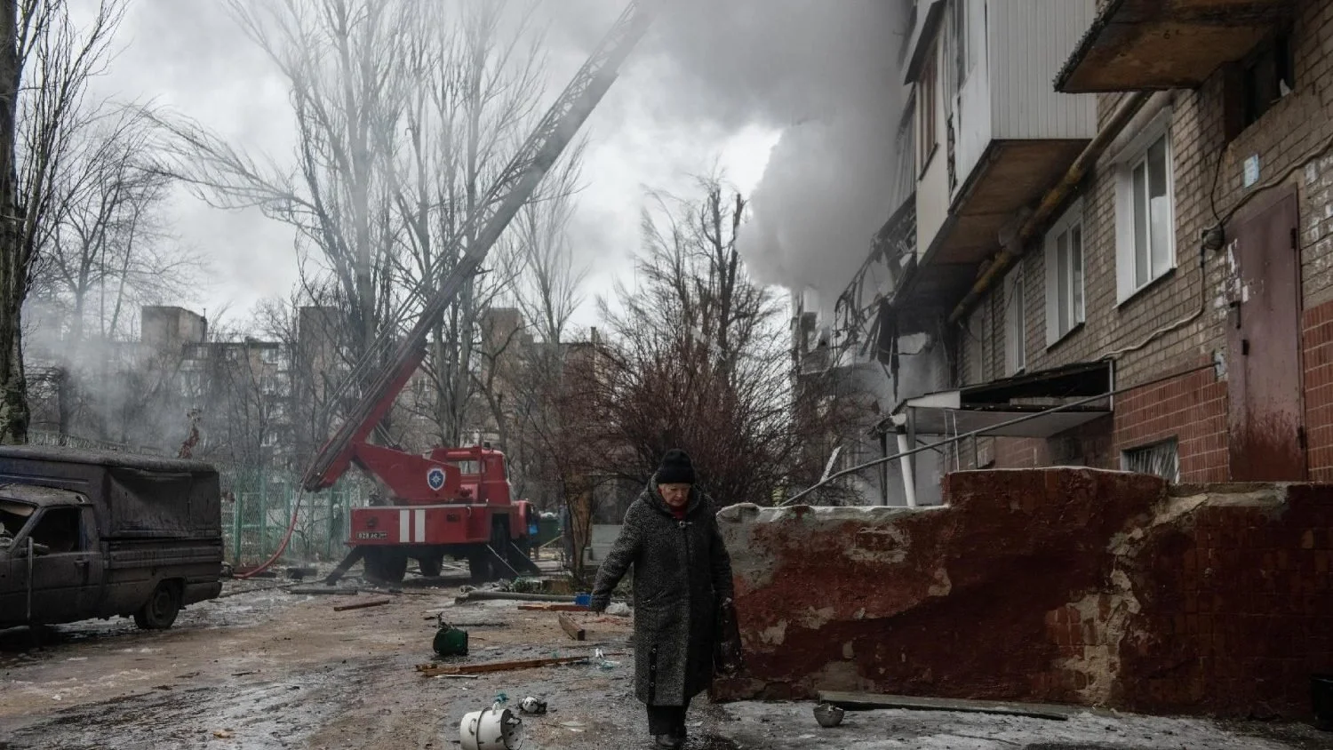 An elderly woman in Donetsk walks past a building damaged by shelling (ANSA)