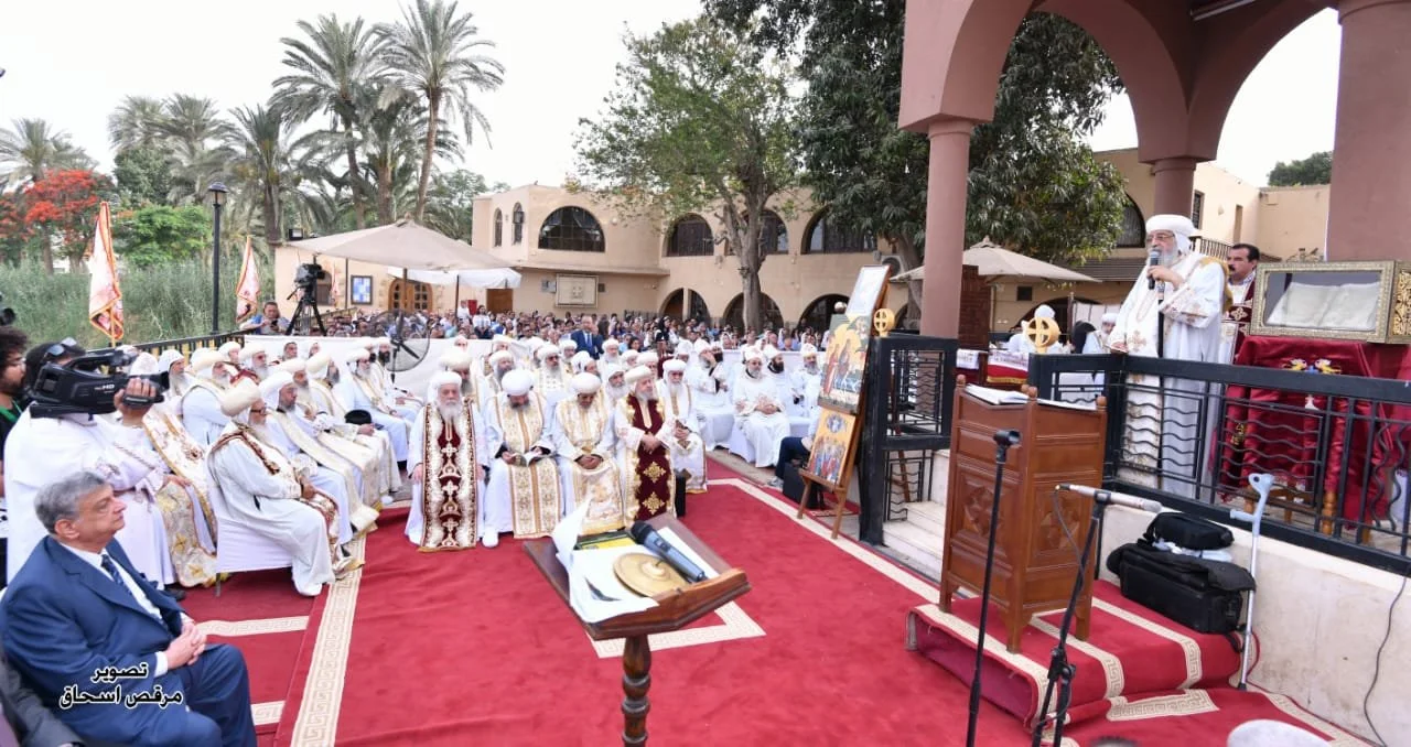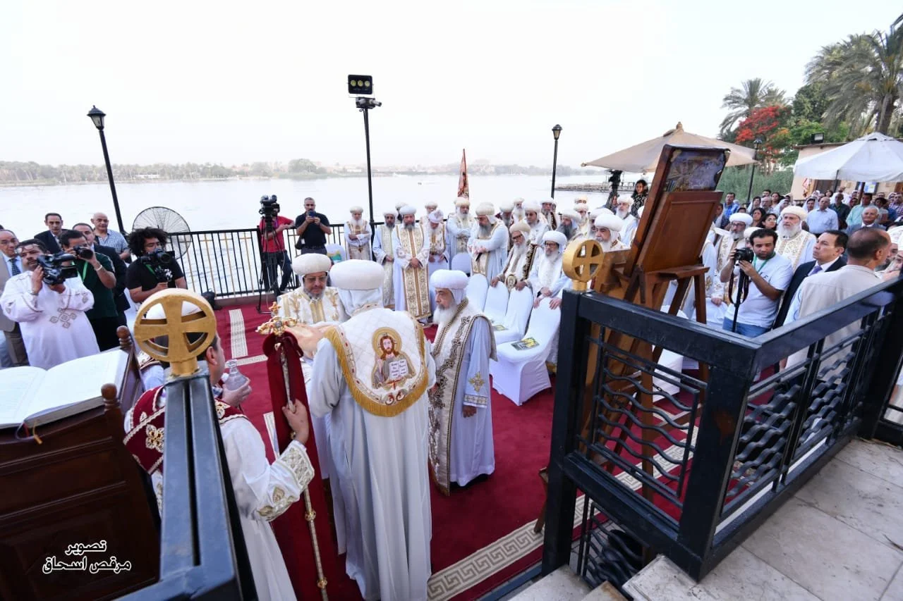 His Holiness Pope Tawadros II blessed the waters of the Nile on which the church is located, by sprinkling the blessing water in it, after the end of the liturgy, which was held in the open air in the area directly overlooking the Nile.