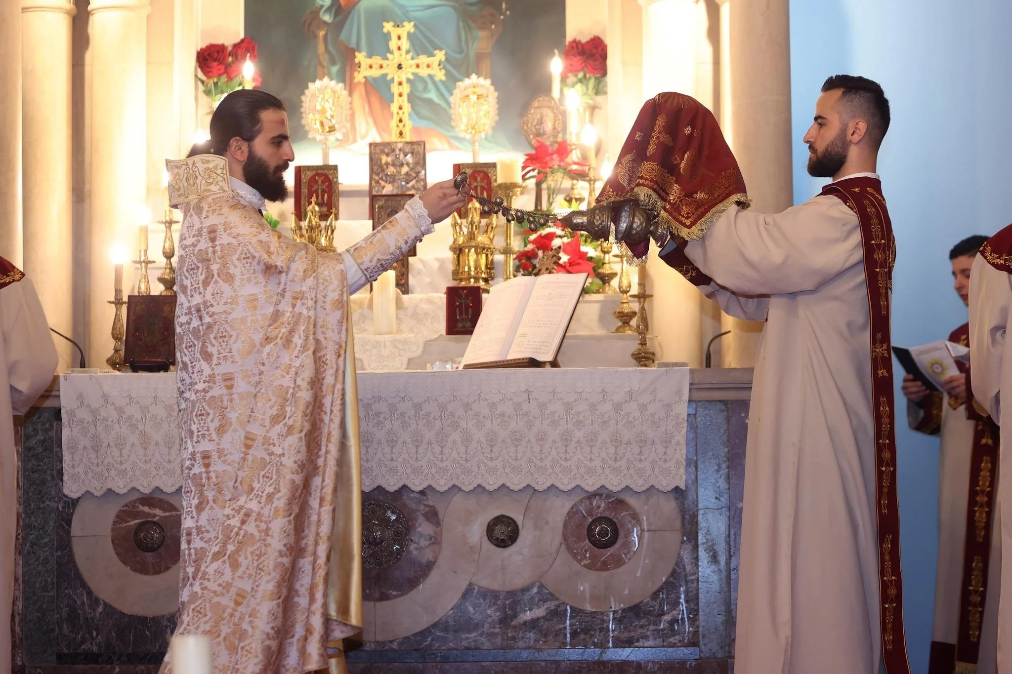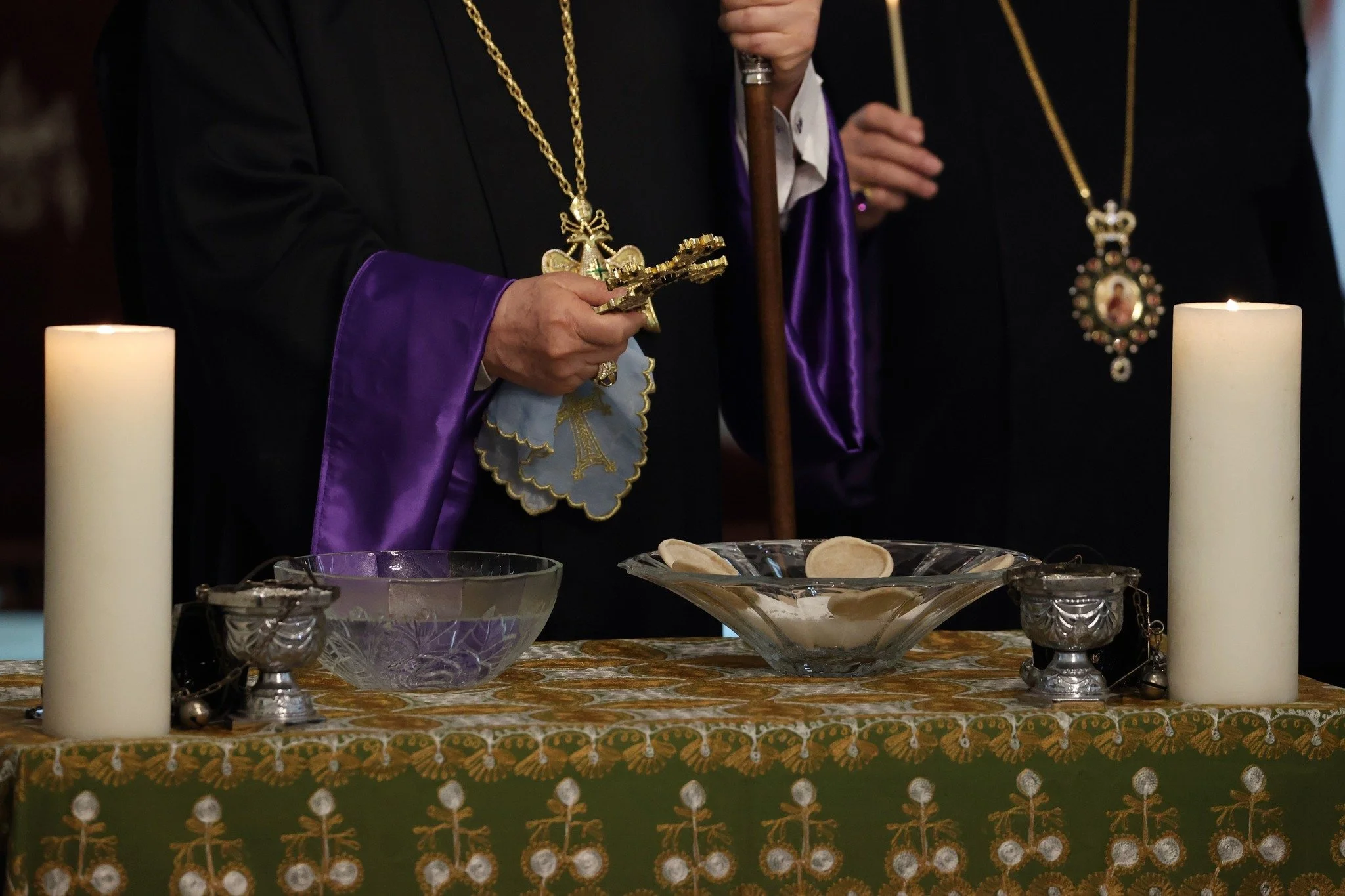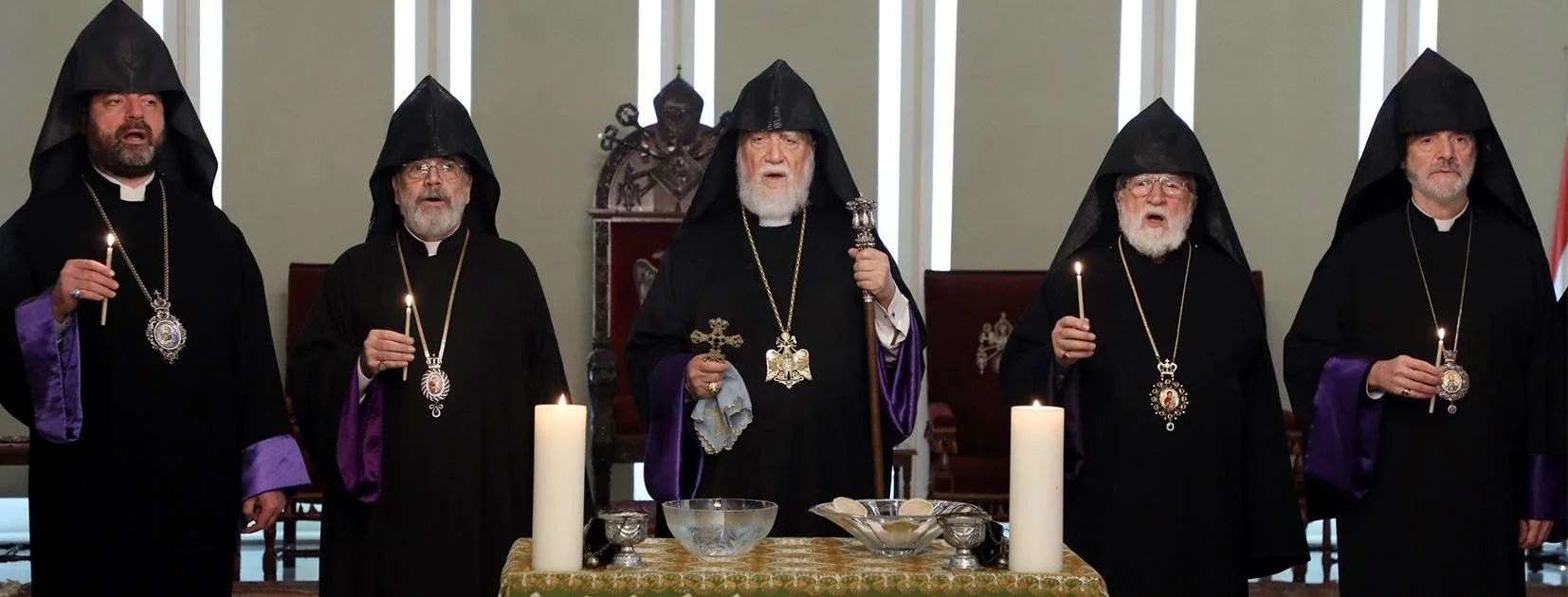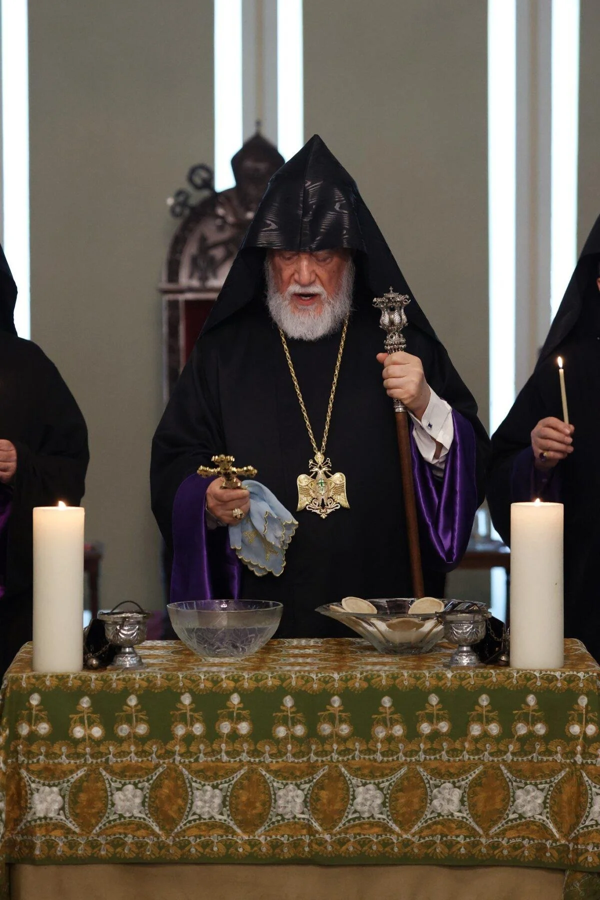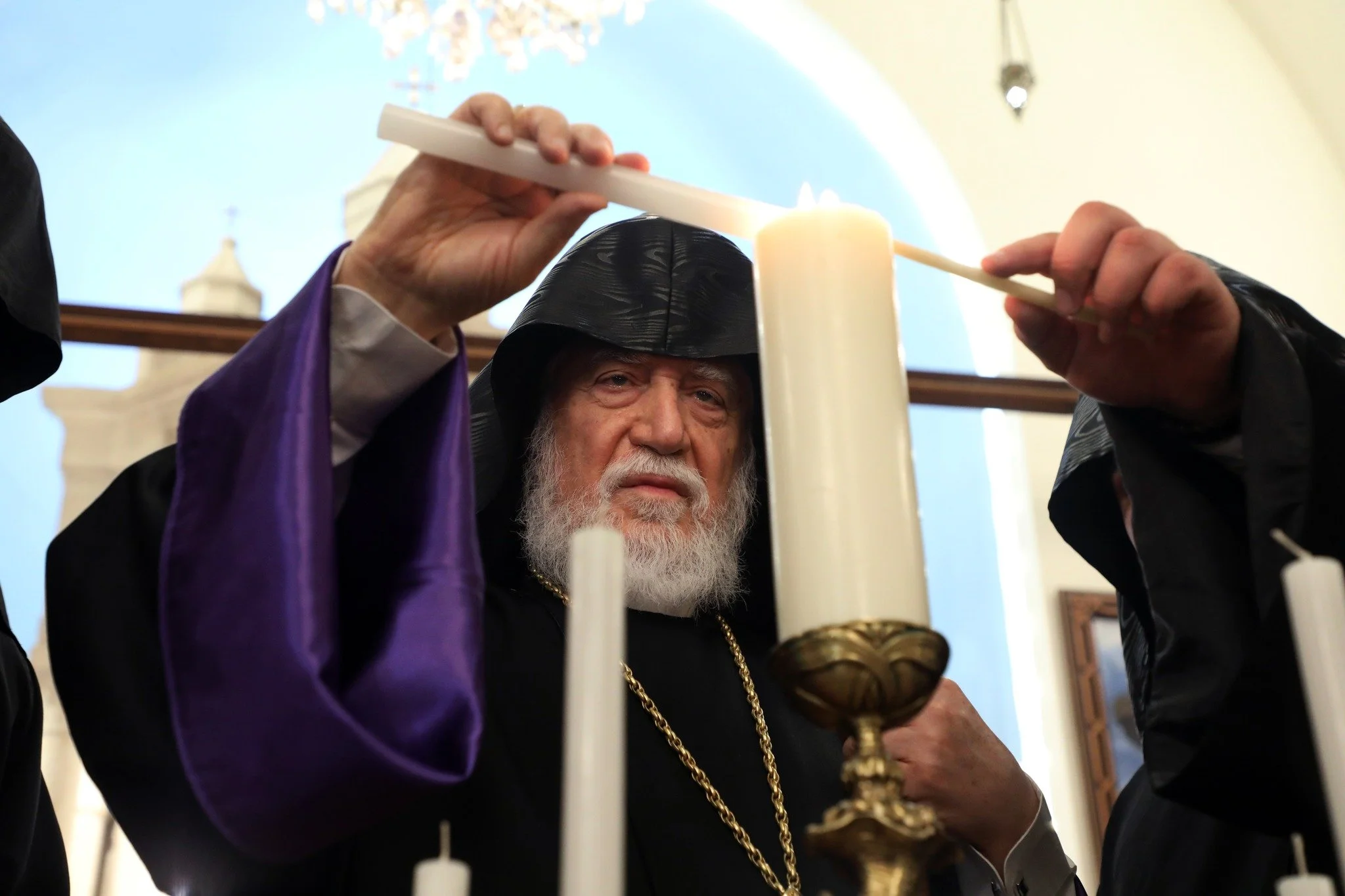 At the end of the Divine Liturgy, the grand sacristan of the Cathedral, His Eminence Arch. Gomidas Ohanian, lit a candle from the altar, symbolizing the Light of Christ, and handed it over to His Holiness Catholicos Aram I, who in turn passed the light to the faithful. Following this, the Pontifical Procession proceeded to the Main Hall of the Catholicosate where Blessing of Home service was held.
