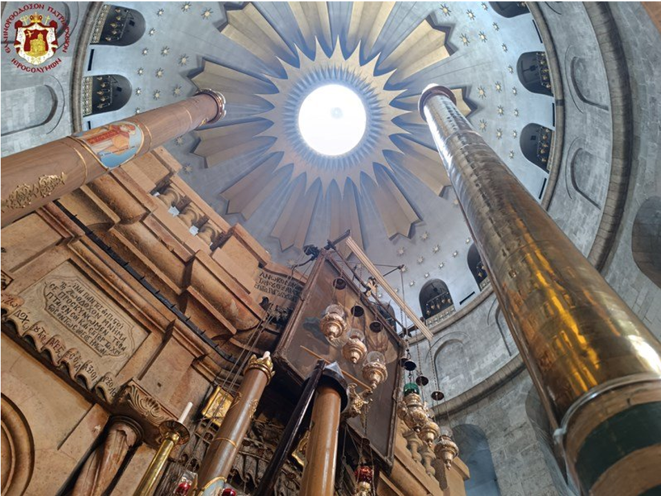 In memory of this event, a Divine Liturgy was celebrated on the Horrendous Golgotha, presided over by His Eminence Archbishop Theophanes of Gerrash, along with the Archimandrites Nectarios, Dionysios, Christodoulos, Priest Ioannis and Archdeacon Mark. The chanting was delivered by Hierodeacon Simeon and the Patriarchal School Students.