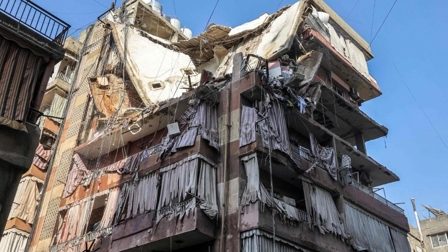 Residential building in southern suburbs of Beirut, Lebanon, whose top two floors were hit by an Israeli strike on 24 September 2024. (AFP or licensors)