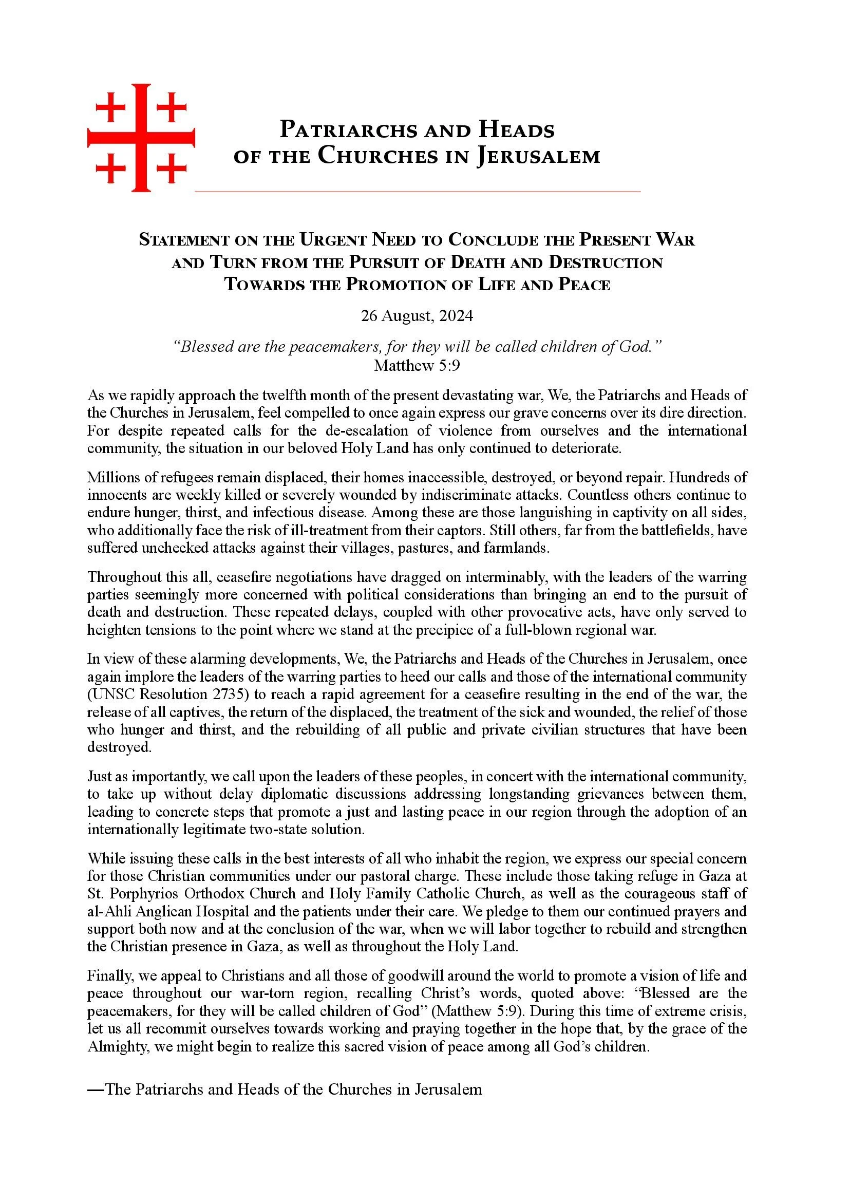 Statement of Their Beatitudes the Patriarchs and Heads of Churches in Jerusalem Regarding the Ongoing War