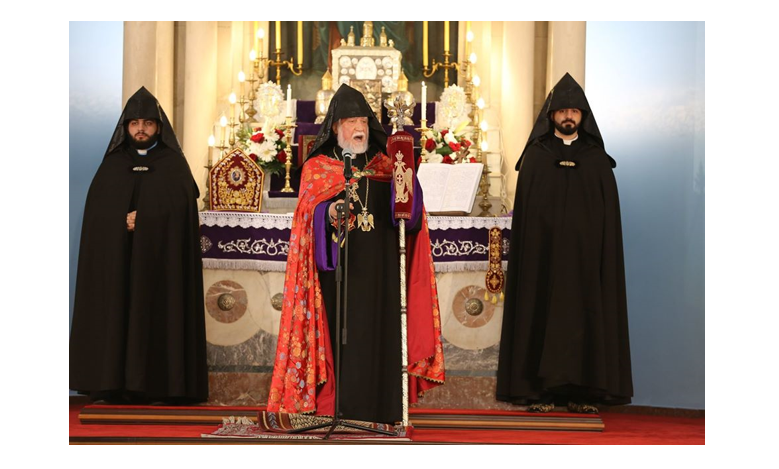 وأكّد الكاثوليكوس آرام الأول في عظته أنّ "قضيّة الشعب الأرمني محقّة لأنّه تعرّض لإبادة من قبل السلطنة العثمانيّة في العام 1915"، وقال: "نحن كأبناء وورثة لهذه الإبادة، نطالب الدولة التركيّة الحالية وريثة السلطنة العثمانيّة بالإعتراف بهذه الإبادة أوّلًا، والمجتمع الدّولي بالتحرّك لنصرة هذه القضيّة الإنسانيّة في الدرجة الأولى من أجل تحقيق العدالة، ونطالب تركيا ثانيًا بالتّعويض عن كلّ الخسائر الماديّة والأراضي المنهوبة والتهجير الّذي تعرّض له الشعب الأرمني".