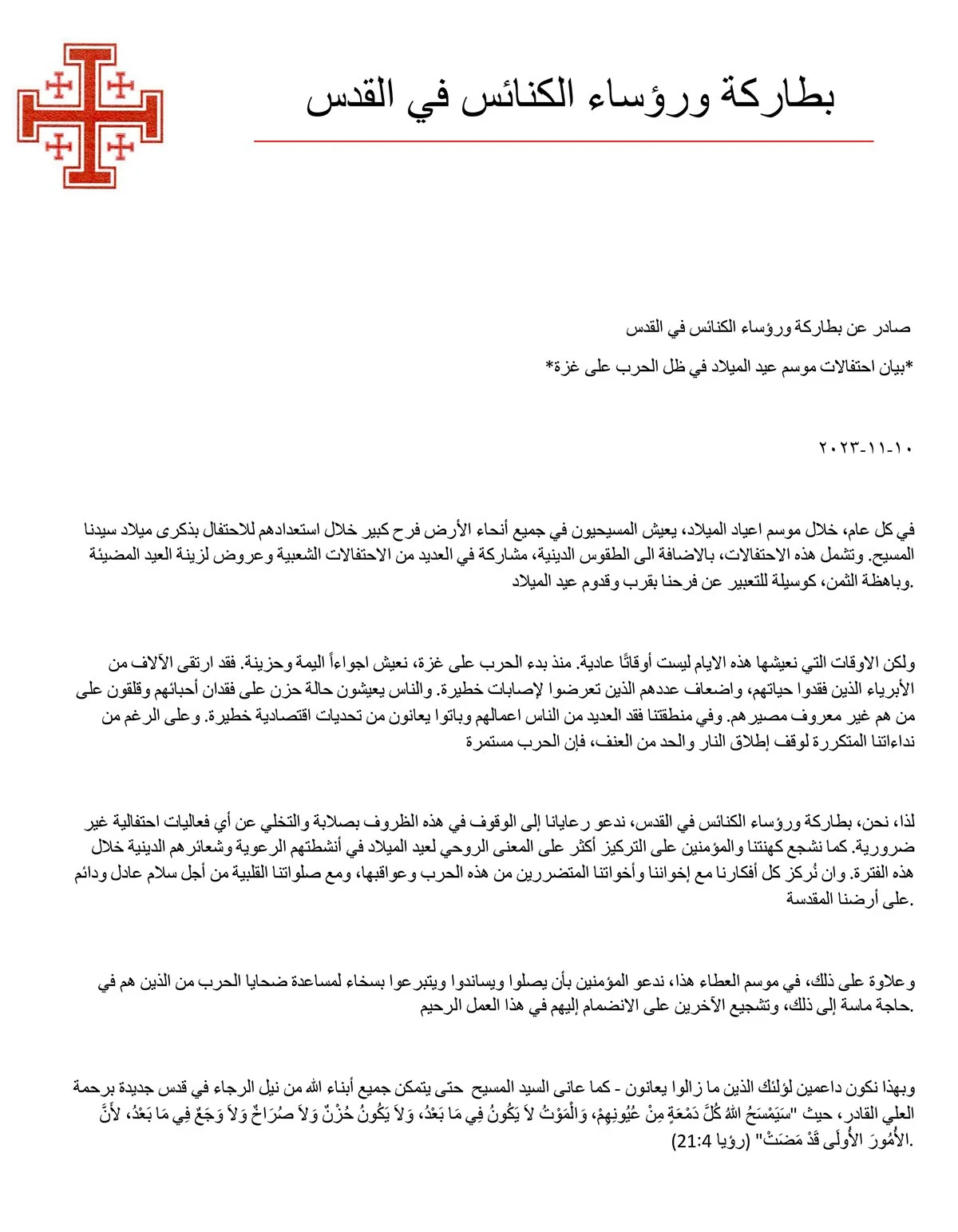 مع قرب بدء الاحتفالات بعيد الميلاد المجيد، ووسط الظروف الّتي تعيشها الأرض المقدّسة، لا سيّما قطاع غزّة، دعا غبطة بطاركة ورؤساء الكنائس في القدس، الجمعة 10 تشرين الثاني/ نوفمبر 2023، الرعايا كافّة إلى التخلّي عن أيّة فعاليّات احتفاليّة غير ضروريّة.