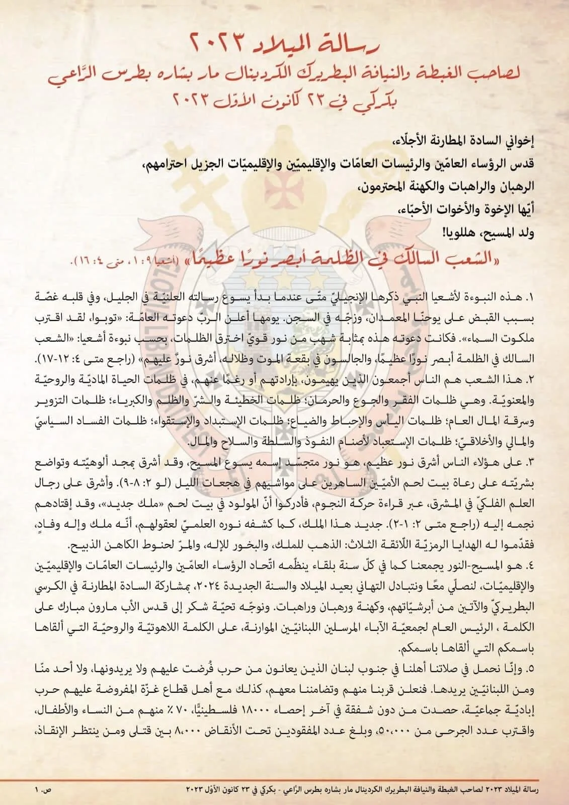 رسالة عيد الميلاد المجيد 2023 من غبطة البطريرك الكردينال مار بشاره بطرس الرَّاعي
