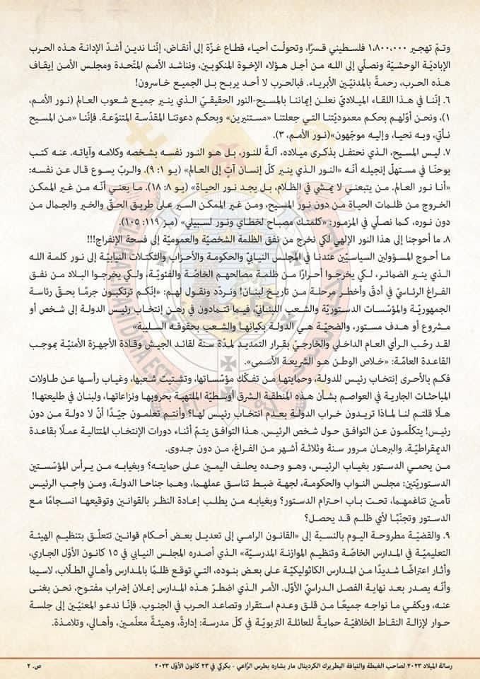 5. وإنّا نحمل في صلاتنا أهلنا في جنوب لبنان الذين يعانون من حرب فُرضت عليهم ولا يريدونها، ولا أحد منّا ومن اللبنانيّين يريدها. فنعلن قربنا منهم وتضامننا معهم، كذلك مع أهل قطاع غزّة المفروضة عليهم حرب إباديّة جماعيّة، حصدت من دون شفقة في آخر إحصاء 18000 فلسطينيًّا، 70 % منهم من النساء والأطفال، واقترب عدد الجرحى من 50،000، وبلغ عدد المفقودين تحت الأنقاض 8،000 بين قتلى ومن ينتظر الإنقاذ، وتمّ تهجير 1،800،000 فلسطيني قسرًا، وتحولّت أحياء قطاع غزّة إلى أنقاض، إنّنا ندين أشدّ الإدانة هذه الحرب الإباديّة الوحشيّة ونصلّي إلى الله من أجل هؤلاء الإخوة المنكوبين، ونناشد الأمم المتّحدة ومجلس الأمن إيقاف هذه الحرب، رحمةً بالمدنيّين الأبرياء. فبالحرب لا أحد يربح بل الجميع خاسرون!