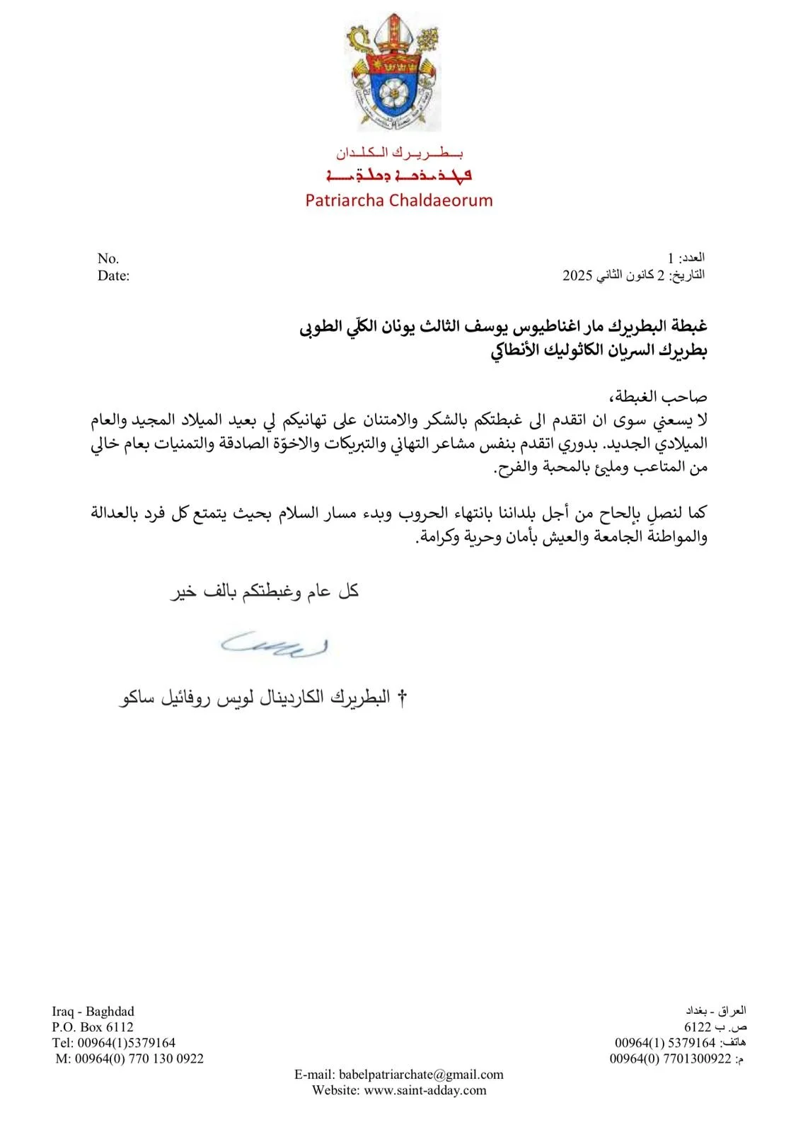 نقلاً عن موقع البطريركيّة الكلدانيّة في بغداد