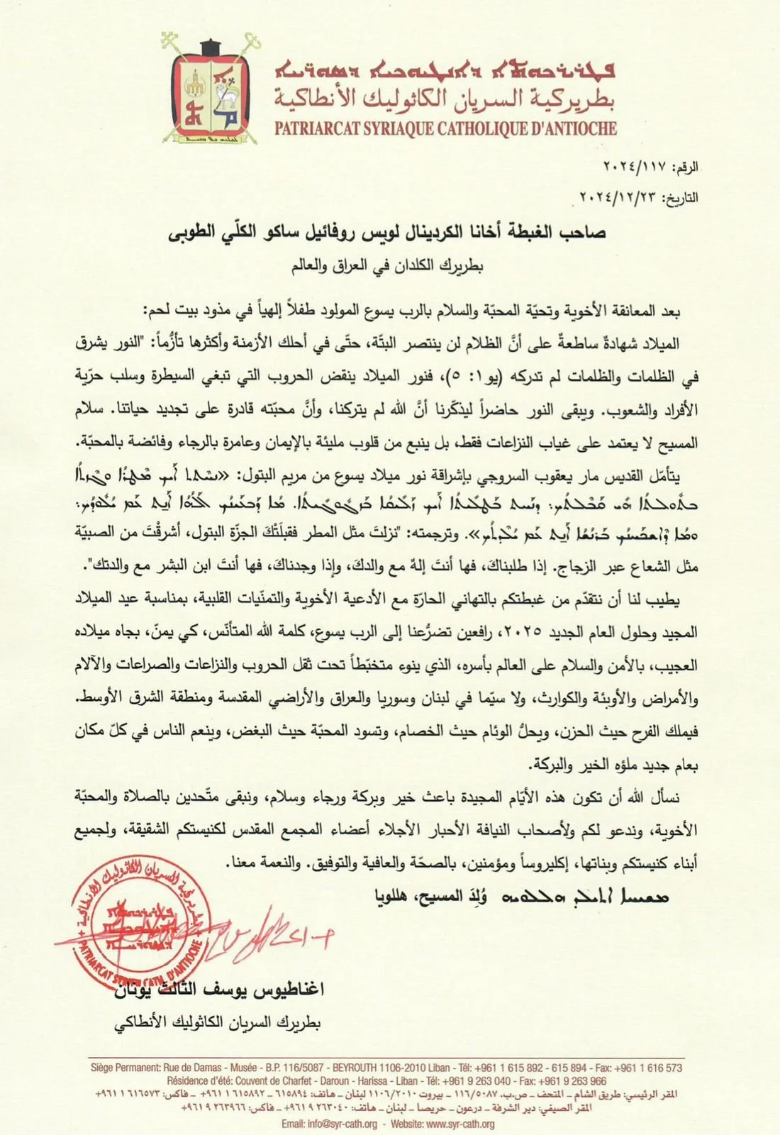 تبادل تهاني العيد بين غبطة البطريرك مار اغناطيوس يوسف الثالث يونان وغبطة البطريرك الكاردينال مار لويس روفائيل ساكو