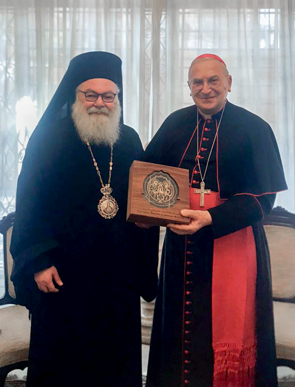 زار غبطة البطريرك يوحنّا العاشر، بطريرك أنطاكية وسائر المشرق للروم الأرثوذكس، ورئيس مجلس كنائس الشرق الأوسط عن العائلة الأرثوذكسيّة، القاصد الرسولي في سوريا الكاردينال ماريو زناري، في مقر السفارة وذلك لمناسبة انتهاء مهامه الديبلوماسية بعد 17 عامًا قضاها كسفير في سوريا. أعرب غبطته عن تقديره للدور الذي لعبه الكاردينال زناري في هذه الفترة المفصلية من تاريخ سوريا والمنطقة مثمنًا دور الكرسي الرسولي في مد جسور التواصل والتلاقي. من جهته أعرب السفير عن تقديره لزيارة البطريرك وللجهود التي يبذلها في ظل التحديات التي تواجه الحضور المسيحي في سوريا والمنطقة.