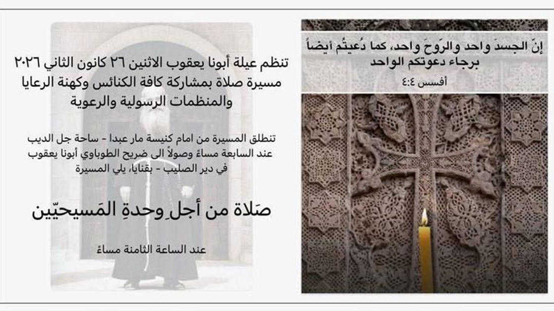 مسيرة وصلاة من أجل وحدة المسيحيّين في لبنان Jan 24 Written By Communication & PR Department Communication انطلاقًا من كنيسة مار عبدا - ساحة جل الديب عند الساعة السابعة مساء، وصولًا إلى ضريح الطوباوي أبونا يعقوب في دير الصليب - بقنايا Communication & PR Department Communication