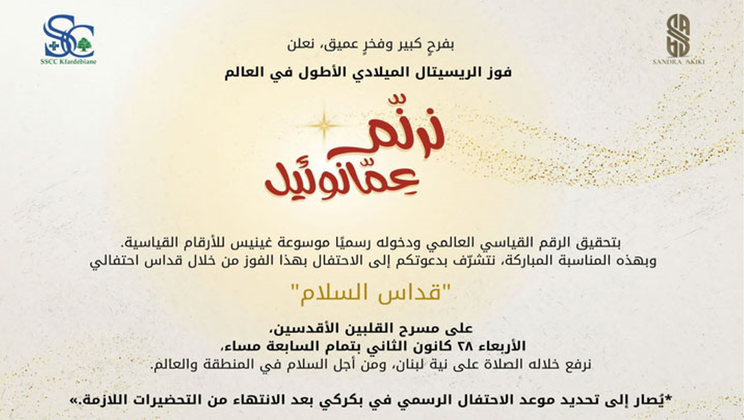 وأعلنت اللّجنة المنظّمة أنّه "بفرح كبير وفخر عميق، فوز الريسيتال الميلادي الأطول في العالم "نرنّم عمّانوئيل" بتحقيق الرقم القياسيّ العالميّ ودخوله رسميًّا موسوعة غينيس للأرقام القياسيّة".