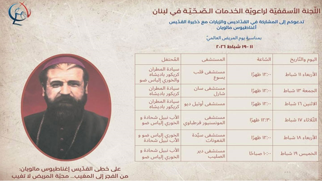 إنطلقت، الأربعاء، في اليوم العالميّ للمريض، زيارة ذخيرة القدّيس إغناطيوس مالويان إلى عدد من المستشفيات في لبنان، بدعوة من اللّجنة الأسقفيّة لراعويّة الخدمات الصّحّيّة في لبنان.