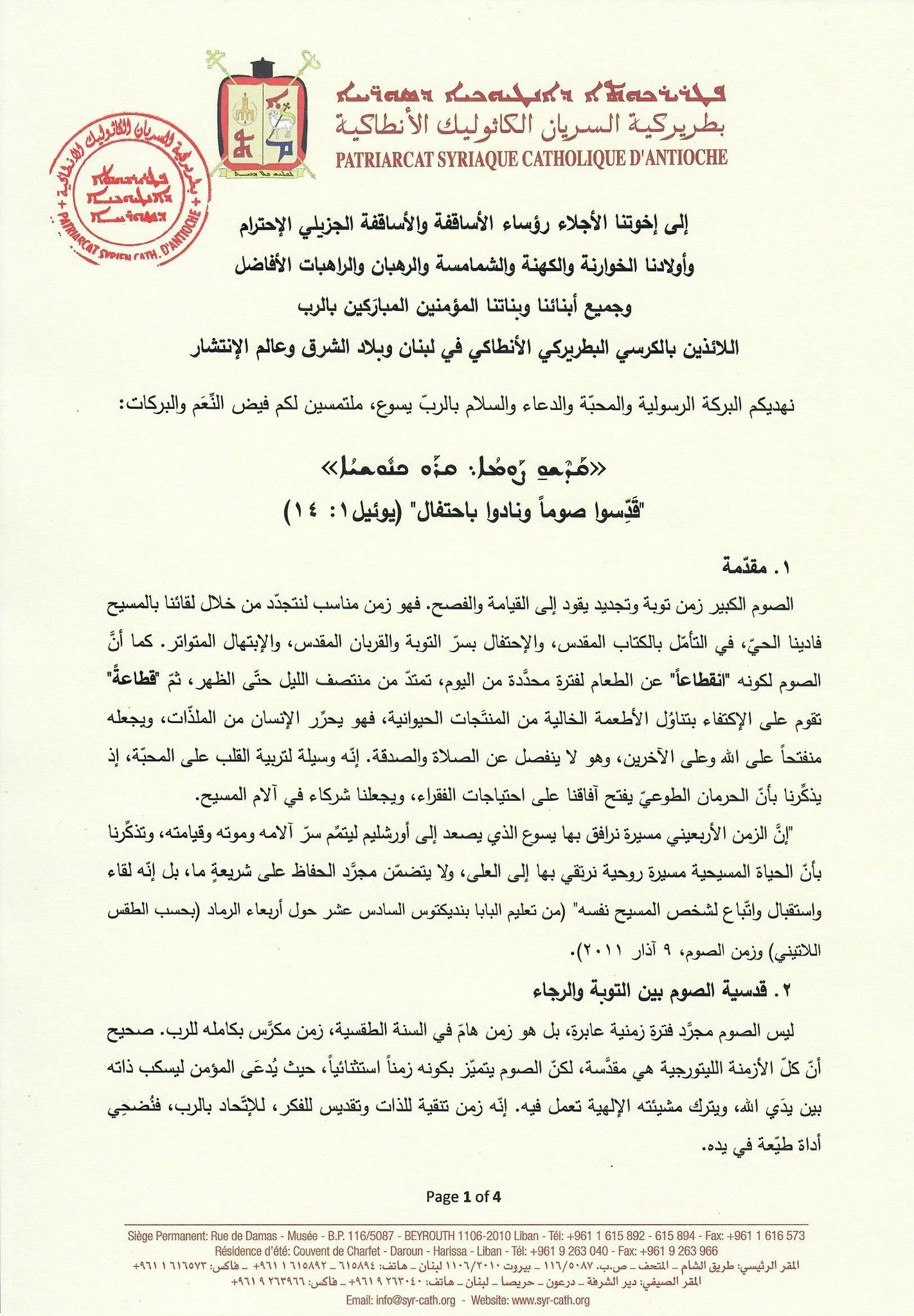 ختاماً، نسأل اللّه أن يتقبّل صومكم وصلاتكم وتوبتكم وصدقتكم، ويؤهّلنا جميعاً لنحتفل بفرح بعيد قيامته المجيدة من بين الأموات. ونمنحكم، أيّها الإخوة والأبناء والبنات الروحيون الأعزّاء، بركتنا الرسولية عربون محبّتنا الأبوية. ولتشملكم جميعاً بركة الثالوث الأقدس: الآب والإبن والروح القدس، الإله الواحد. والنعمة معكم.