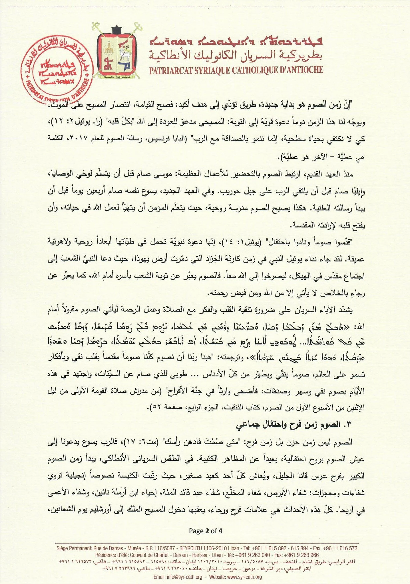 هذه الرسالة قد نُشرت على صفحة البطريركيّة السريانيّة الأنطاكيّة على موقع فيسبوك.