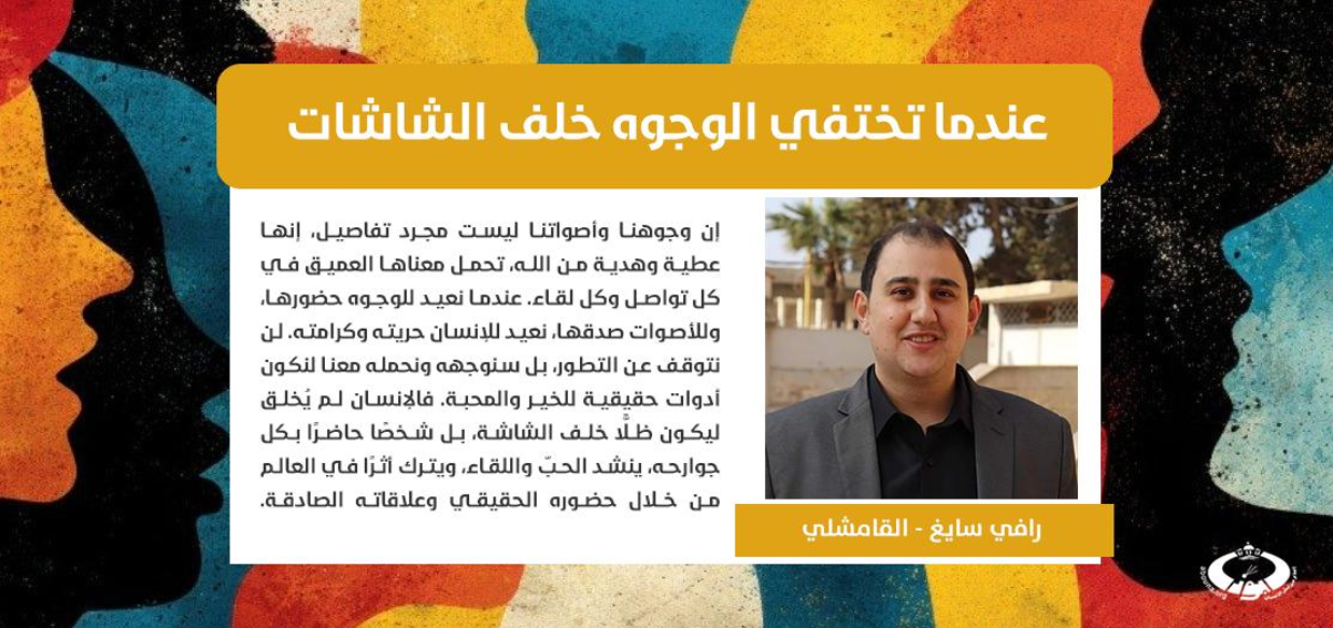 اليوم، لا نريد وجوهًا وأصواتًا تختفي خلف الشاشات، بل نريد أن نتذكر جميعًا أننا خلقنا على صورة اللّه ومثاله. نريد أن نرى الآخر الذي بجانبنا، وفيه نجد قصص نجاحنا وتطورنا، وكعلامة محبة ولقاء، لا انعزال أو انغلاق.