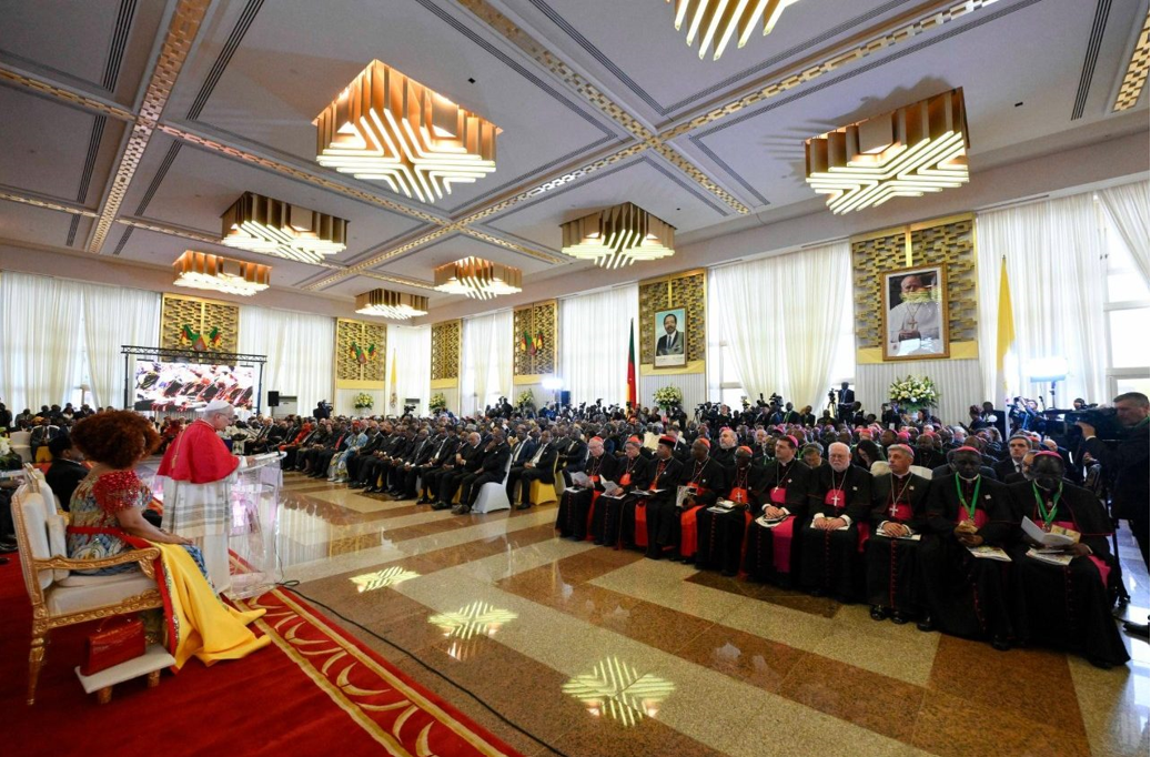 بعد انتهاء اللقاء الخاص، توجه الحبر الأعظم إلى قاعة الاجتماعات الكبرى، حيث التقى السلطات، والمجتمع المدني، والسلك الدبلوماسي في البلاد وللمناسبة وجّه الأب الأقدس كلمة رحّب بها بضيوفه وقال: "أشكركم من أعماق قلبي على الاستقبال الحار الذي خصصتموني به، وعلى كلمات الترحيب التي وُجهت إليّ. إنه لمن دواعي سروري العميق أن أتواجد في الكاميرون، التي تُوصف غالباً بأنها "أفريقيا في نموذج مصغَّر" نظراً لغنى أراضيها وثقافاتها ولغاتها وتقاليدها. إن هذا التنوع ليس ضعفاً، بل هو كنز؛ وهو يمثل وعداً بالأخوّة وأساساً راسخاً لبناء سلام دائم".