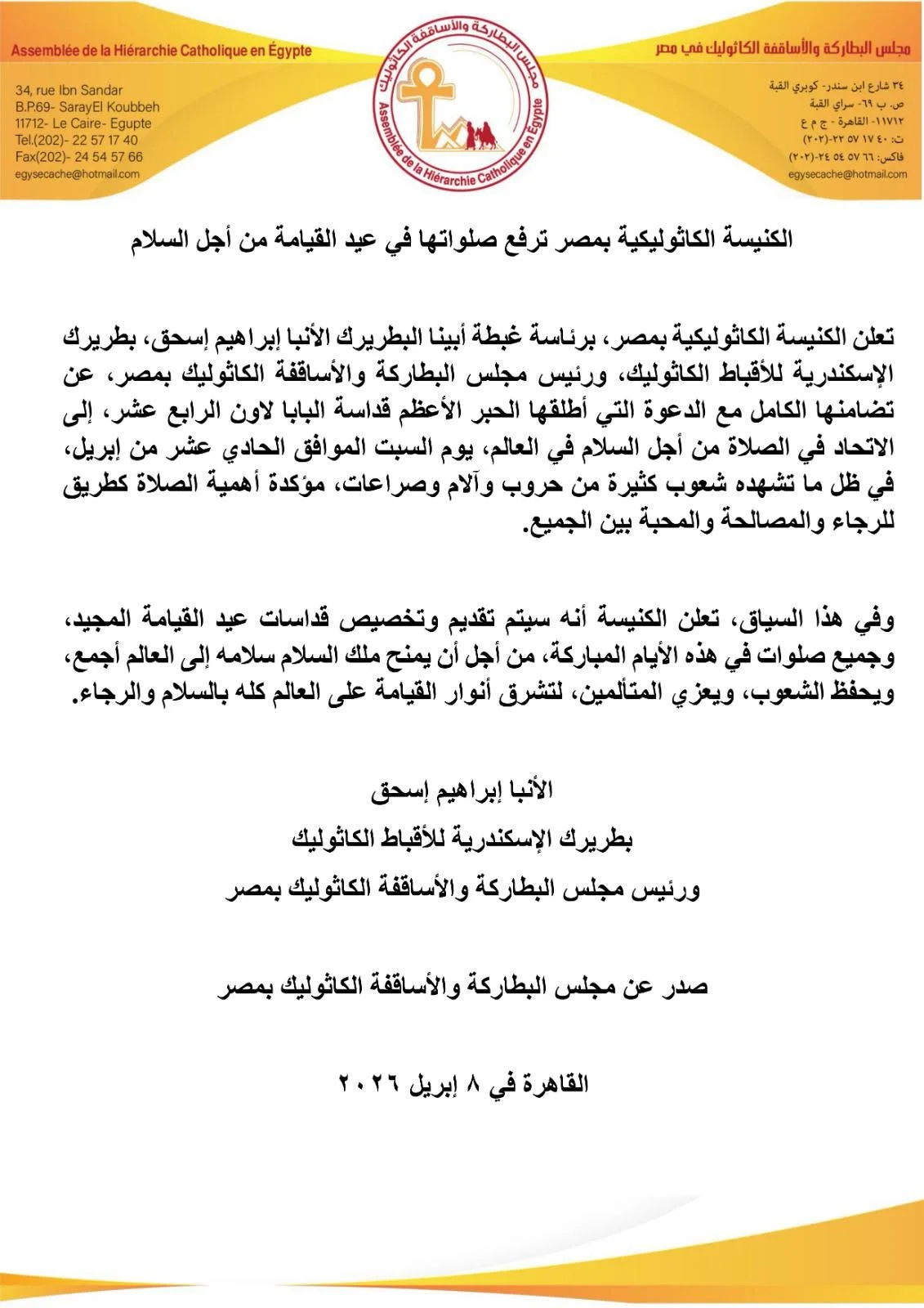 الكنيسة الكاثوليكية في مصر، برئاسة غبطة البطريرك الأنبا إبراهيم إسحق، ترفع صلواتها في عيد القيامة من أجل السلام