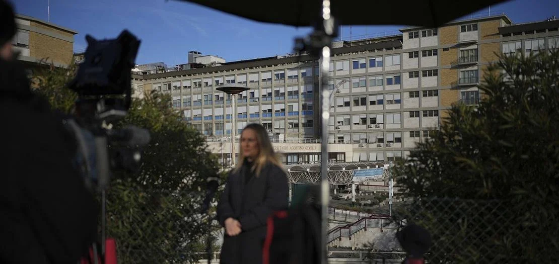 مراسلون صحفيون يقفون أمام مستشفى أغوستينو جيميلي في روما، الثلاثاء 18 شباط/ فبراير 2025