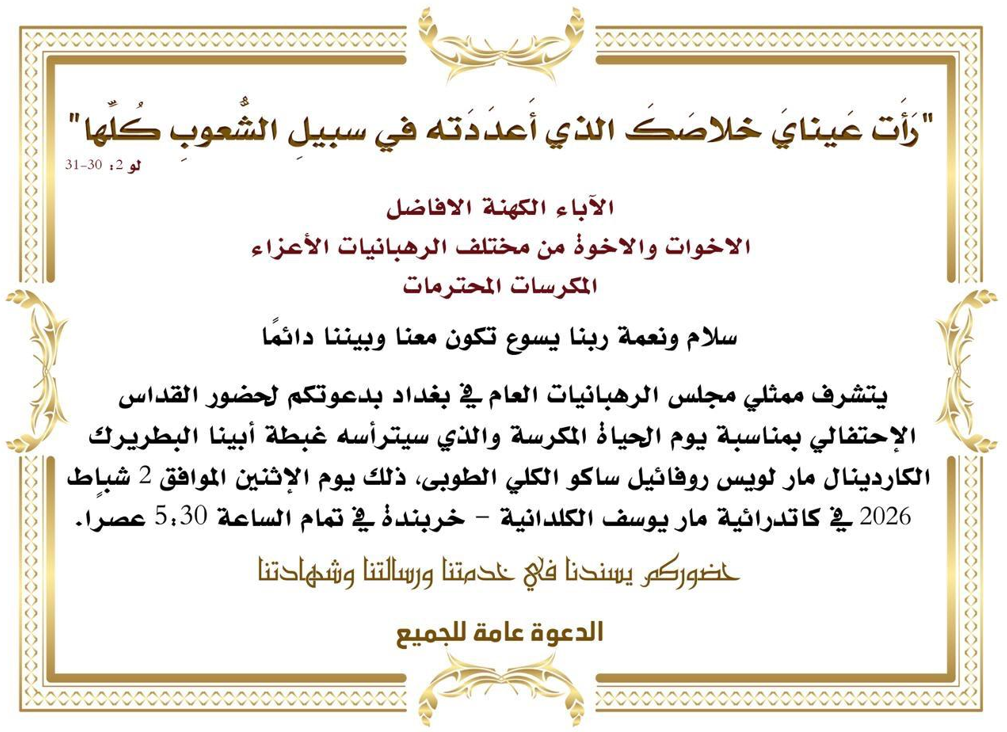 تجدون في التّالي دعوة من ممثّلي مجلس الرهبانيّات العام في بغداد للمشاركة في قدّاس احتفالي يترأّسه غبطة البطريرك الكاردينال لويس روفائيل ساكو، بطريرك الكلدان في العراق والعالم، والرئيس الفخري لمجلس كنائس الشرق الأوسط، لمناسبة يوم الحياة المكرّسة، وذلك يوم الاثنين 2 شباط/ فبراير 2026، الساعة 5:30 عصرًا، في كاتدرائيّة مار يوسف الكلدانيّة، خربندة - بغداد.